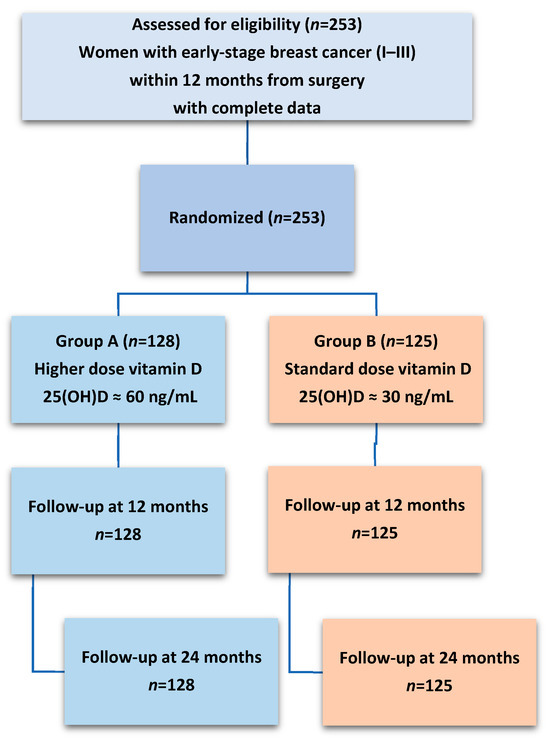 This study was conducted as part of the DEDiCa Trial, a multicenter randomized controlled trial involving hospitals across Italy [48]. The protocol was approved by the Italian Ministry of Health, Italian Medicine Agency—AIFA (EudraCT Number 2015-005147-14) and by the Ethics Committee of each recruiting center (ClinicalTrials.gov identifier NCT02786875). DEDiCa trial investigated the effect of a low glycemic index Mediterranean diet, physical activity, and vitamin D supplementation on breast cancer recurrence. Eligible participants were women aged 30–74 years who had histologically confirmed primary breast cancer (stages I–III according to the TNM staging system), had undergone breast cancer surgery within the previous 12 months, had no evidence of metastatic disease, and had no contraindications for vitamin D supplementation or any components of the lifestyle treatment. Participants were disease-free at study entry, and the cancer stage reported in Table 1 refers to the pathological stage at surgery, which occurred before randomization and was balanced between the two intervention groups. All participants provided written informed consent, and the study protocol was approved by the institutional review boards of each participating site. Participants were randomized into one of two treatment groups. In the high-intensity arm (Group A), participants received structured counseling to follow a low-glycemic-index Mediterranean diet, engage in regular physical activity, and take personalized doses of oral vitamin D (cholecalciferol) to achieve and maintain serum 25(OH)D levels of 60 ng/mL. The low-intensity arm (Group B, positive control) received general advice to adopt a Mediterranean diet and avoid sedentary behavior, along with a standard dose of oral vitamin D to maintain serum 25(OH)D levels at sufficiency (30 ng/mL). The interventions lasted for 33 months. In this analysis, we used complete data from 253 patients (group A: n = 128; group B: n = 125) at three time points: baseline, 12 months, and 24 months (Figure 3).