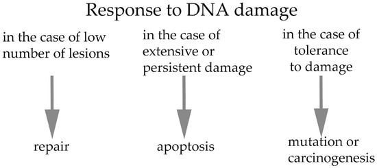 The response to DNA damage can, in principle, lead to three possible outcomes: (i) repair of DNA damage; (ii) cell death mediated by activation of the apoptotic pathway; or (iii) mutation or eventual carcinogenesis.