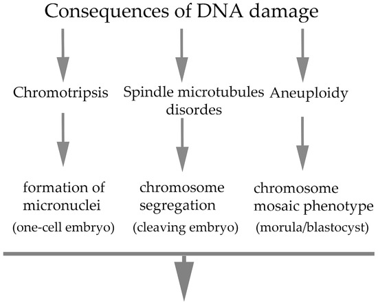 Simplified scheme of the consequences of DNA damage in embryos during early cleaving stages and implantation period. The developmental stages at which the phenotypes have been most frequently detected and indicated in parentheses (corresponding representative references: [46,73,74,75,78,79,86,87]).
