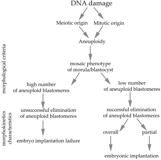 As already documented, meiotic aneuploidy is significantly influenced by the mother’s age [116,129,130,131], where dysfunction of mitochondrial processes also likely contributes to reproductive aging [132], unlike in males, where age does not play such a significant role [133,134]. In connection with these findings, mitochondrial supplementation is considered a potential therapeutic tool to slow oocyte aging [135,136,137,138]. Although there are various causes of aneuploidy, this phenomenon is highly complex and often leads to developmental arrest, implantation failure, or spontaneous abortion in both natural and assisted reproduction [139]. Phenotypes of blastocysts induced by DNA damage and subsequent implantation outcomes are summarized in Figure 3.