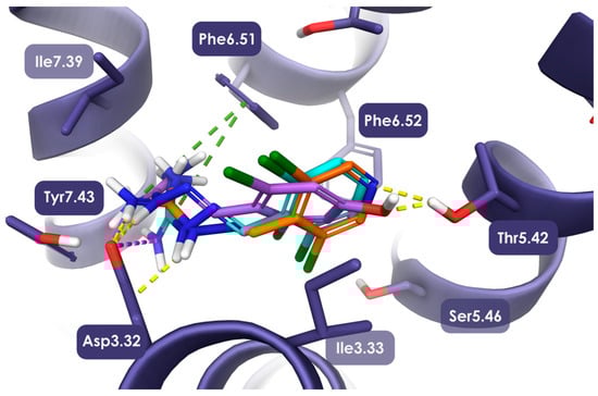 Binding mode of E-JP-14 (orange), guanabenz (cyan) and 4-OH-guanabenz (purple) in the 8ZSS structure of TAAR1. The guanidine group of E-JP-14 and the 2,6-dichloro-4-hydroxyphenyl moiety of guanabenz and its derivate formed a hydrogen bond and a salt bridge with Asp3.32 (yellow and pink dashed lines, respectively). Additionally, this group was stabilized by a π-cation interaction with Phe6.51 (green dashed line). Within the orthosteric pocket, the dichloropyrimidine moiety was stabilized by a hydrogen bond with Thr5.42.