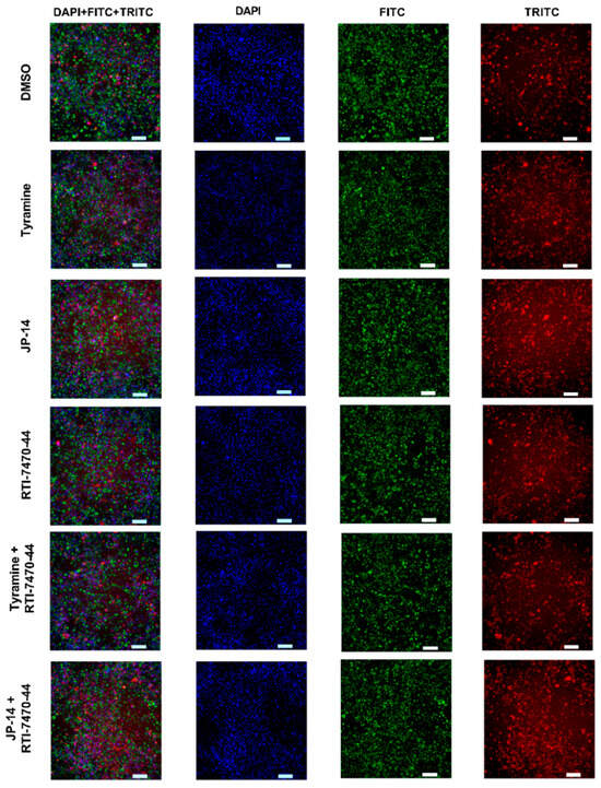 High-content screening images of phospholipidosis and steatosis in 3T3-L1 adipocyte cells. Images of 3T3-L1 adipocyte cells pretreated with control (0.5% DMSO), tyramine, RTI-7470-44, JP-14, and combinations of RTI-7470-44 with JP-14 or tyramine. Fluorescent staining was performed with the LipidTOX assay: Green (FITC channel—fluorescein isothiocyanate) labels lysosomal phospholipid accumulation; Red (TRITC channel—tetramethylrhodamine isothiocyanate) labels neutral lipid droplets indicative of steatosis; Blue (DAPI—4′,6-diamidino-2-phenylindole, Hoechst 33342) marks nuclei. Images were acquired using High Content Screening technology (ImageXpress XLS, Molecular Devices, San Jose, CA, USA). A scale bar representing 100 µm is shown in each image.