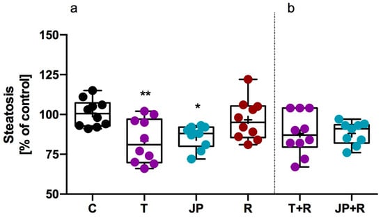 The effects of tested compounds on steatosis in 3T3-L1 cells. The impact of the compounds on steatosis (a). The effect of TAAR1 receptor blockade on steatosis following co-treatment with the TAAR1 antagonist RTI-7470-44 (b). C—control, T—tyramine, JP—JP-14, R—RTI-7470-44, T + R—tyramine + RTI-7470-44; mean (marked with “+”) ± SD (box); whiskers indicate minimum and maximum values; median (marked with a line); n = 9–12; one-way ANOVA followed by Dunnett’s post hoc test; * p ≤ 0.05, ** p ≤ 0.01 vs. vehicle (control).