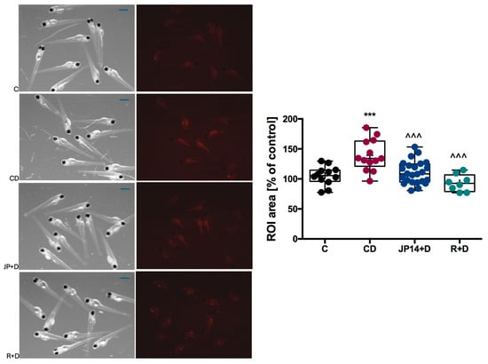 Lipid-reducing activity of JP-14 at concentration of 10 µg/mL in the Nile red fat metabolism assay. Representative pictures and quantitative image analysis of lipid in Danio rerio larvae after E3 alone, 10 µg/mL JP-14 or 20 µg/mL resveratrol exposure. C—control, CD—control dyed, JP14+D—JP-14 dyed, R+D—resveratrol dyed; mean (marked with “+”) ± SD (box); whiskers indicate minimum and maximum values; median (marked with a line); n = 8–24; one-way ANOVA test; Tuckey’s post hoc test; *—vs. control without staining (C), ^—vs. control dyed (E3 dyed group, CD); difference was considered when ***, ^^^ p < 0.001, magnification 2×, a scale bar representing 1000 µm is shown in each image.