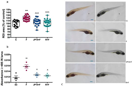 Oil Red O staining: quantitative results of size of the yolk—ROI area (a); the intensity of the larva’s color-dependent on the presence of lipids (b); representative pictures of Danio rerio larvae and ROI area (yellow line) after incubation with fructose and tested compounds, magnification: 4× (c); C—control larva—incubated with E3 alone, F—larva after incubation with 4% fructose solution, JP14+F—larva after incubation with 4% fructose solution and JP-14 at concentration 10 µg/mL, JP14+R—larva after incubation with 4% fructose solution and resveratrol at concentration 20 µg/mL; mean (marked with “+”) ± SD (box); whiskers indicate minimum and maximum values, median (marked with a line); n = 20–24 (a) or Mean ± SD, n = 4 (b); Kruskal–Wallis’s test; Dunn’s post hoc test (b); *—vs. C group (E3 alone), ^—vs. F group (E3 + fructose); difference was considered when ^ p < 0.05, ** p< 0.01, ***, ^^^ p < 0.001, a scale bar representing 500 µm is shown in each image.