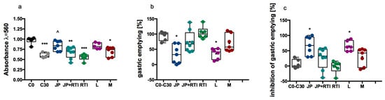Effects of JP-14, RTI-7470-44, and reference compounds on gastric emptying in mice: absorbance of gastric samples (a); % gastric emptying (b); % inhibition of gastric emptying (c); C0—control sample collected immediately after dye administration (time 0, zero% gastric emptying); C30—control sample collected 30 min after dye administration (time 30, maximum gastric emptying); JP—JP-14, JP+RTI—JP14+RTI, RTI—RTI-7470-44 (antagonist of TAAR1); L—loperamide; M—metformin; mean (marked with “+”) ± SD (box); whiskers indicate minimum and maximum values; median (marked with a line); n = 6–8; Kruskal–Wallis’s test; Dunn’s post hoc test; *—vs. C, ^—vs. C30 (a); *—vs. C0-C30 i.e., 100% (b); *—vs. C0-C30 i.e., 0% (c); difference was considered when *,^ p < 0.05, ** p< 0.01, *** p < 0.001.
