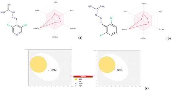 Bioavailability radars for JP-14 (a) and guanbabenz (b); boiled egg plots (c). POLAR—polarity, INSOLU—solubility, INSATU—saturation, FLEX—flexibility, LIPO—lipophilicity; the pink area illustrates the desired properties of the molecule; BBB—blood–brain barrier; HIA—intestinal absorption; PGP+—P-glycoprotein substrate; PGP−—P-glycoprotein non-substrate; GNB—guanabenz; TPSA—topological polar surface area; WLOGP—Log P value according to the Wildman and Crippen model—the partition coefficient between n-octanol and water; the outer gray region indicates compounds with reduced gastrointestinal absorption and restricted BBB penetration, the white region signifies the physicochemical space of molecules that are most likely to undergo passive human intestinal absorption (HIA), and the yellow region denotes the physicochemical space of molecules with the greatest likelihood of crossing the BBB.