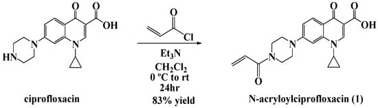 For our studies, we chose ciprofloxacin as the platform antibiotic for the formation of the polyacrylate nanoparticles. The N-acryloyl derivative of commercial ciprofloxacin hydrochloride was prepared for this purpose according to our previously reported acylation procedure (Figure 2) [].