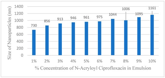 Average size of emulsified nanoparticles versus the % weight concentration of N-acryloylciprofloxacin in the nanoparticle emulsions.