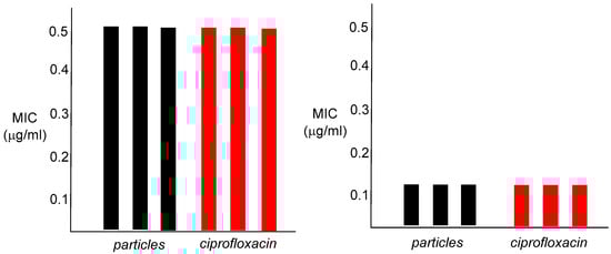 To investigate whether the nanoparticles possess antibiotic capabilities, each crude emulsion was tested against Staphylococcus aureus (ATCC 25923) and Escherichia coli (K12) using a 96-well plate broth assay to determine the minimum inhibitory concentration (MIC). The procedure is described in the Materials and Methods section. The MIC determination was conducted in triplicates for each bacterium, with ciprofloxacin hydrochloride being used as a positive control and a blank broth used as a negative control. The MIC was the lowest concentration of the antibiotic that completely inhibited bacterial growth (visually) within that series of dilutions.