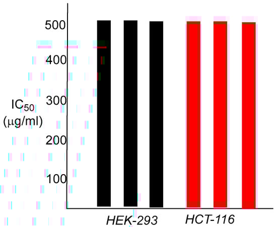 50% cell inhibitory concentration (IC50) values for emulsified poly (N-acryloylciprofloxacin) against HEK-293 cells (left) and HCT-116 cells (right). Values reflect fluorescence intensity at both 595 nm and 630 nm compared to that of the untreated control cell with 100% cell growth. Each bar represents one assay, with each sample being tested in triplicate.