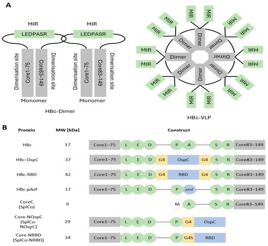 - Skamel, C.; Ploss, M.; Böttcher, B.; Stehle, T.; Wallich, R.; Simon, M.M.; Nassal, M. Hepatitis B virus capsid-like particles can display the complete, dimeric outer surface protein C and stimulate production of protective antibody responses against Borrelia burgdorferi infection. J. Biol. Chem. 2006, 281, 17474–17481. [Google Scholar] [CrossRef]