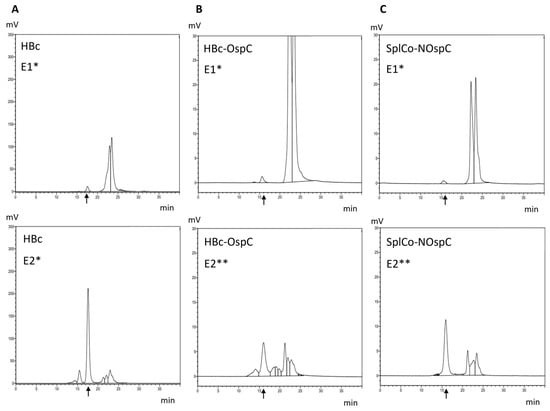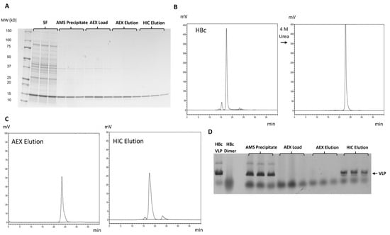 - Li, Z.; Wei, J.; Yang, Y.; Ma, X.; Hou, B.; An, W.; Hua, Z.; Zhang, J.; Li, Y.; Ma, G.; et al. Strong hydrophobicity enables efficient purification of HBc VLPs displaying various antigen epitopes through hydrophobic interaction chromatography. Biochem. Eng. J. 2018, 140, 157–167. [Google Scholar] [CrossRef]