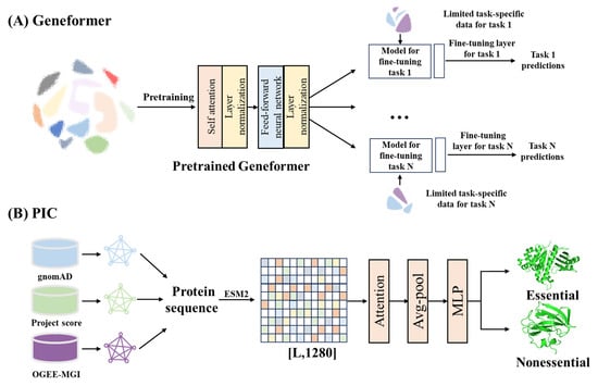 | 2 | PIC | A framework built on the pretrained Evolutionary Scale Modeling 2 (ESM2) protein language model. It extracts sequence features via an embedding module, captures residue importance through an attention module, and outputs probability-based predictions of protein essentiality across human tissues, cell lines, and mouse. The resulting Protein Essentiality Score quantifies protein importance, supports breast-cancer prognostic marker identification, and evaluates microprotein function [143]. | https://github.com/KangBoming/PIC (accessed on 20 August 2025) |