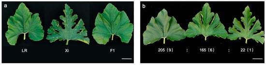 To investigate the inheritance pattern of the lobed leaf trait in zucchini, the entire leaf accession and lobed leaf accession were selected as parents to construct a population. The parental lines exhibited distinct leaf morphologies: LR showed entire (non-lobed) leaves, while Xi displayed deeply lobed leaves in field conditions. The F1 generation uniformly presented entire leaves (Figure 1a), phenotypically identical to the LR parent, suggesting that the lobed leaf trait is recessively inherited. We performed a phenotypic characterization of 392 F2 progeny through visual assessment in field conditions. The leaf margin phenotypes showed clear qualitative variation in lobation depth, allowing unambiguous classification. Comparative analysis revealed three distinct classes: 205 with entire leaves, 165 with shallowly lobed leaves, and 22 deeply lobed leaves, approximating a 9:6:1 ratio. The leaf morphology became distinguishable at the third true leaf stage, with clear differentiation by the fifth leaf stage (Figure 1b). Chi-square analysis confirmed that the observed segregation ratio (9 entire:6 shallowly lobed:1 deeply lobed) matched the expected ratio (χ2 = 3.549, χ20.05 = 5.991; Figure 1b, Table 1). These results suggest that the leaf lobation trait is controlled by two recessive genes.