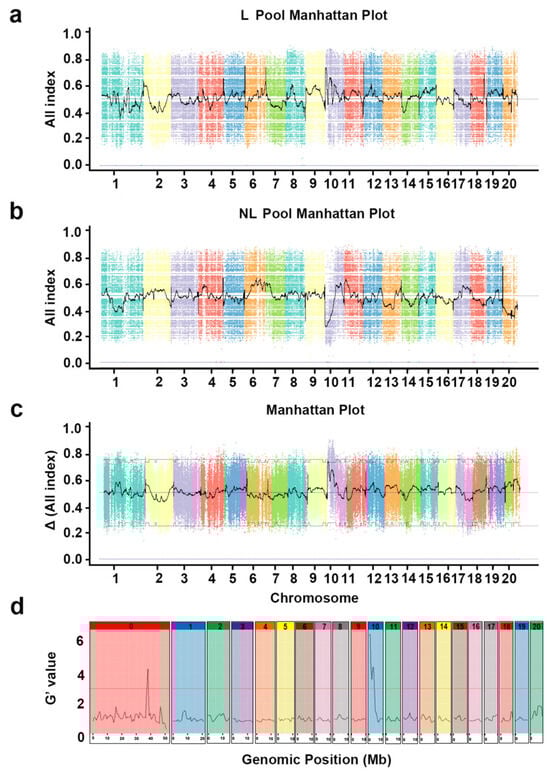 We performed BSA analysis to identify genetic loci associated with leaf margin morphology in zucchini. From an F2 segregating population, we selected 30 individuals each exhibiting extreme entire-leaf or deeply lobed leaf phenotypes. Genomic DNA was extracted using the CTAB method [] and equal amounts from each extreme group were pooled to construct L pool (lobed) and NL pool (non-lobed) bulks. Sequencing libraries were prepared with the TruSeq Nano DNA HT Kit (Illumina, San Diego, CA, USA) using 1.5 μg input DNA per sample, followed by 150 bp paired-end sequencing on an Illumina HiSeq™ PE150 platform (average insert size: 350 bp). Raw reads were quality-filtered using FASTQC [] and aligned to the zucchini genome (http://cucurbitgenomics.org/organism/14, accessed on 1 September 2020) using BWA []. PCR duplicates were removed using SAMtools [], followed by variant calling with GATK3.8 [] and annotation using ANNOVAR (2015Dec14) []. The single nucleotide polymorphism index (SNP-index) was calculated for each bulk according to Takagi et al. [], with positions showing an SNP-index <0.3 being excluded from further analysis. We performed sliding-window analysis (1 Mb window size, 10 kb step size) to identify genomic regions with significant Δ(SNP-index) differences between bulks, using 1000 permutation tests at a 95% confidence level as the significance threshold.