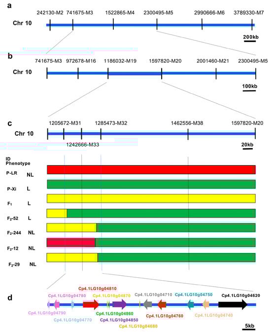 To identify candidate loci controlling the lobed leaf trait in zucchini, we performed BSA-seq using the parental lines (LR and Xi) and extreme phenotype pools from the F2 population (non-lobed pool and lobed leaf pool), each sequenced to approximately 10× genome coverage. Whole-genome resequencing was conducted to facilitate preliminary quantitative trait locus (QTL) mapping. Sequencing of the lobed leaf–entire leaf bulks was performed using the Illumina HiSeq4000 platform, generating 24.038 G of clean data. The majority of the obtained data were of high quality, with Q20 ≥ 96.38%, Q30 ≥ 90.84%, and the G/C ratios ranging from 38.55% to 40.02% (Table S3). After removing duplicates, the single nucleotide polymorphism (SNP) indices of the L pool (lobed leaf pool) and NL pool (non-lobed leaf pool) were calculated, and frequency distribution maps of the progeny SNPs across each chromosome were generated (Figure 2a,b). Subsequently, Δ(SNP-index) was obtained by subtracting the SNP-index of the N pool from that of the NL pool, and peak regions exceeding the threshold were selected as candidate regions for QTLs associated with the target trait (Figure 2c). At the 95% confidence level, one major candidate region was identified on chromosome 10. However, based on the trait segregation ratio of the F2 population, the lobed leaf trait should be regulated by two pairs of genes. Therefore, we used QTL Sequencing R package (QTLseqr) to analyze the data, including the reads mapped to the scaffolds (shown as chromosome 0), and calculated G’ values mapped to the genomic position. At the 99% significance level, two genomic regions, Cp4.1LG10: 204700-3790420 and Cp4.1LG00: 37128116-38176795, showed G’ values exceeding the threshold (Figure 2d). However, since the genes on the scaffolds (chromosome 0) have not been accurately positioned in the zucchini genome, fine mapping could not be performed. Therefore, we next focused on fine mapping the target genes within the candidate region on chromosome 10. The peak regions from the two mapping results overlapped in the 3.42 Mb region (Cp4.1LG Chr10: 204700-3790420; 95% significance level), further supporting that the candidate gene is likely located in this region (Table S4).