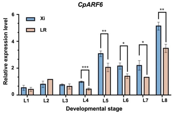 Expression analysis of the candidate gene CpARF6. L1–L8 represents the first true leaf development stage; ‘Xi’ and ‘LR’ represent two parents; ‘*’ indicates p < 0.05, ‘**’ indicates p < 0.01, ‘***’ indicates p < 0.001. Statistical analysis using one-way ANOVA. Three biological replicates were set up in the experiment.