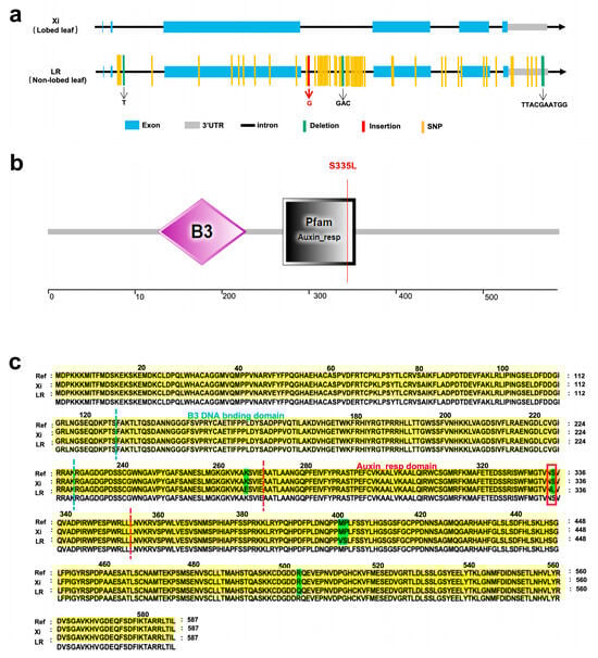 In order to further investigate the genetic basis of the lobed leaf trait, we cloned the CpARF6 gene and analyzed the sequence variations between the two parents. The CpARF6 gene consists of six exons (Figure 5a) and encodes a protein composed of 587 amino acids. Sequence analysis between the LR and Xi parental lines showed multiple SNPs and InDels in both intronic and exonic regions of the candidate gene CpARF6. The genomic DNA sequences of CpARF6 in LR and Xi were 3451 bp and 3464 bp, respectively (Figure S2). There were 57 SNPs and four InDels in the intron, exon and 3′UTR regions. Within the coding region, we detected 12 SNPs, including five nonsynonymous mutations: K265E (lysine to glutamic acid), S335L (serine to leucine), M400V (methionine to valine), P401S (proline to serine), and R502Q (arginine to glutamine) (Figure 5c). The putative protein contains an auxin response factor domain and a B3 DNA-binding domain (DBD) (Figure 5b). Notably, the S335L substitution in the LR parent occurred within the auxin-responsive domain of the protein, which could potentially cause structural alterations and functional abnormalities. To investigate the evolutionary and functional conservation of this gene, we extracted 22 protein sequences homologous to the candidate gene CpARF6 from Arabidopsis thaliana and other plant species. We then performed multiple sequence alignment and constructed a phylogenetic tree. These results revealed that this homologous gene is widely present in seven cucurbit crops, including Cucurbita moschata, Cucurbita maxima, Cucurbita argyrosperma, Cucumis melo, Cucumis sativus, Citrullus lanatus, and Benincasa hispida, as well as in Arabidopsis (Figure S3). Further sequence alignment showed that all these homologous proteins, including the Arabidopsis orthologue, exhibit a high degree of sequence conservation (Figure S4), strongly suggesting that their function may be highly conserved across species.