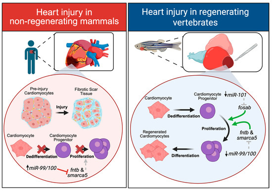 Cell-type responses to heart injury. In non-regenerating mammals, heart injury leads to the formation of fibrotic scar tissue, and surviving cardiomyocytes do not dedifferentiate or proliferate in response to injury. After a heart injury, miR-99-5p/100-5p expression remains high, and it continues to downregulate its target genes, fntb (beta subunit of farnesyl-transferase) and smarca5, (SWI/SNF-related matrix associated actin-dependent regulator of chromatin subfamily a) which results in impaired cardiomyocyte proliferation. After a heart injury in regenerating vertebrates like the zebrafish, no fibrotic scar tissue forms, and cardiomyocytes dedifferentiate into progenitor cells that rapidly proliferate to give rise to newly regenerated cardiomyocytes. Both miR-101-3p and miR-99-5p/100-5p are downregulated which results in the subsequent increase in their target genes fosab (FBJ murine osteosarcoma viral oncogene homolog Ab) and fntb/smarca5, respectively, to promote cardiomyocyte proliferation. Green arrows indicate activation. Grey dotted arrows (left panel) indicate relief of activation and grey dotted lines (right panel) indicate relief of inhibition. Red crosses indicate inhibition. Created with BioRender.com.