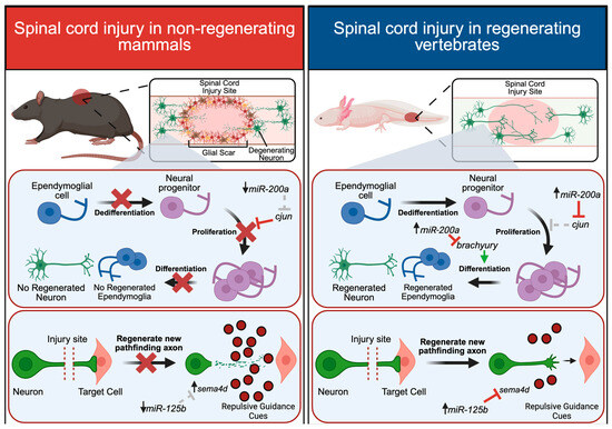 Cell-type responses to a spinal cord injury. A spinal cord injury in mammals (e.g rat) results in the formation of a physical barrier of glial cells around the injury site, known as the glial scar, and neurons surrounding the injury site rapidly degenerate. Ependymal glial cells do not dedifferentiate or proliferate and injured neurons do not regenerate pathfinding axons. miR-200a is downregulated, leading to the upregulation of its mRNA target c-jun, which prevents ependymoglia proliferation and promotes glial scar formation. miR-125b is also downregulated, leading to the upregulation of the repulsive guidance cue, Sema4D (semaphorin 4D) which further prevents any surviving neurons from extending new axons towards their synaptic targets. In regeneration-competent vertebrates (e.g., axolotl), no glial scar tissue forms, and neurons are able to extend new axons to re-establish lost connections with target cells. Ependymoglial cells dedifferentiate into neural progenitor cells which rapidly proliferate to ultimately differentiate into newly regenerated neurons or glial cells. miR-200a is upregulated to downregulate its target genes, c-jun and brachyury, which promote proliferation and differentiation into neurons or glia. Injured neurons are able to regenerate new pathfinding axons, which use external guidance cues to navigate towards their synaptic targets. miR-125b is upregulated after injury to downregulate the expression of the repulsive guidance cue, Sema4D. Created with BioRender.com.