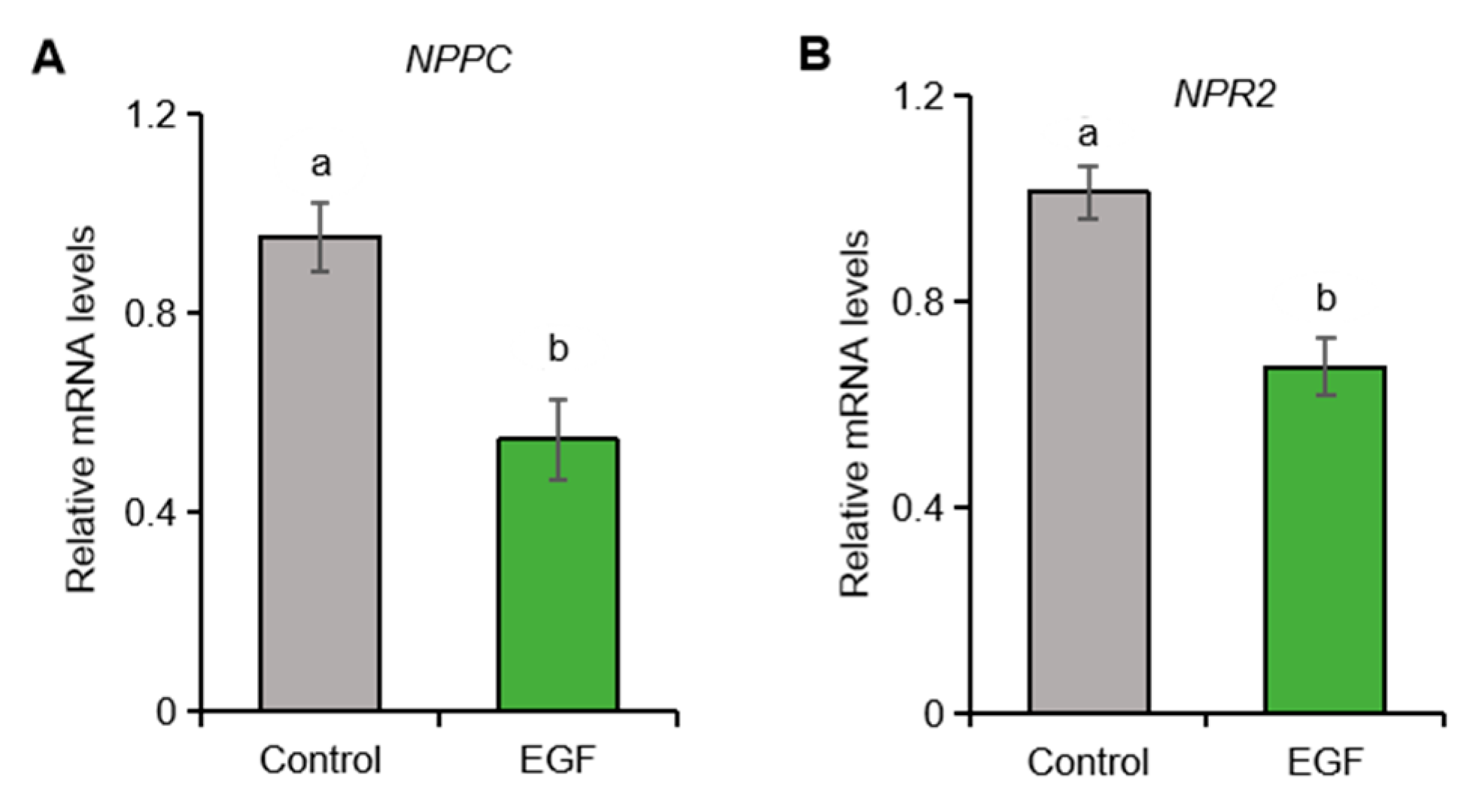 2.5. EGF Suppresses the Expression of NPPC and NPR2 in Porcine Granulosa Cells