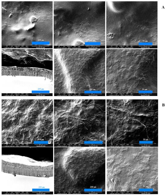 The results of scanning electron microscopy for double-layer films consisting of a furcellaran layer and a chitosan–furcellaran complex layer at ratios of 9:1, 8:2, and 7:3 are graphically presented in the figure below (Figure 1).