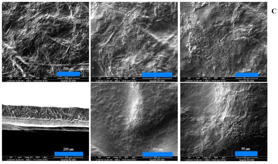 (A) SEM images of double-layer films with complex_9:1. The three photos on top—complex layer side (taken at ×200, ×100, ×50 magnifications), two photos on the bottom right—furcellaran layer side (taken at ×200, ×50 magnifications), cross-section—one photo on the left at the bottom (taken at ×200 magnification). (B) SEM images of double-layer films with complex_8:2. The three photos on top—complex layer side (taken at ×500, ×200, ×50 magnifications), two photos on the bottom right—furcellaran layer side (taken at ×200, ×50 magnifications), cross-section—one photo on the left at the bottom (taken at ×200 magnification). (C) SEM images of double-layer films with complex_7:3. The three photos on top—complex layer side (taken at ×500, ×200, ×50 magnifications), two photos on the bottom right—furcellaran layer side (taken at ×200, ×50 magnifications), cross-section—one photo on the left at the bottom (taken at ×200 magnification).