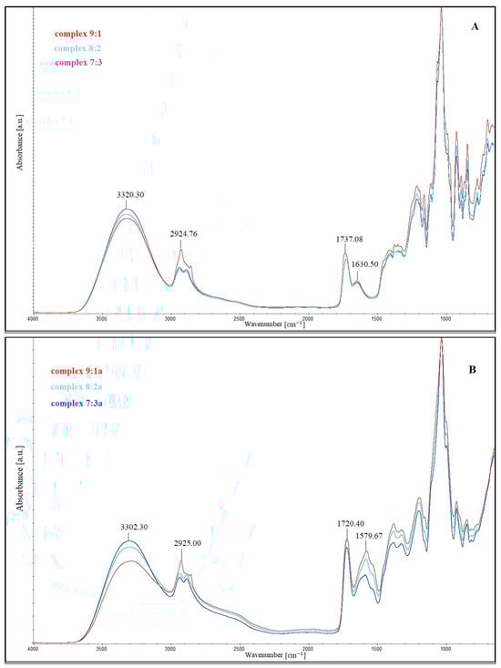 The double-layer films (designated as the 9:1, 8:2 and 7:3 complexes) shown in Figure 3A,B, composed of a furcellaran layer (measurement from this side marked with the letter a) and a furcellaran-chitosan complex (measurement from their side without the letter a), clearly indicate differences between the layers and between the CHIT-FUR complex (single-layer film). A significant shift in the absorption band from 3300 cm−1 to ~3320 cm−1 indicates the involvement of amide and hydroxyl groups in the formation of the complex. The analysis of the obtained double-layer films (Figure 3A,B) also indicates a lower intensity of bands in this region (3300–3200 cm−1) corresponding to, among others, –OH groups, which may suggest a higher share of hydrogen bondings in the (9:1) double-layer film. An additional band at ~1720 cm−1, characteristic of the ester bond carbonyl group, not present in the spectra of pure polysaccharides or the CHIT-FUR single-layer film, may indicate possible interactions between the furcellaran layer and the CHIT-FUR complex (double-layer film). These data correspond to the results obtained from SEM and AFM measurements.