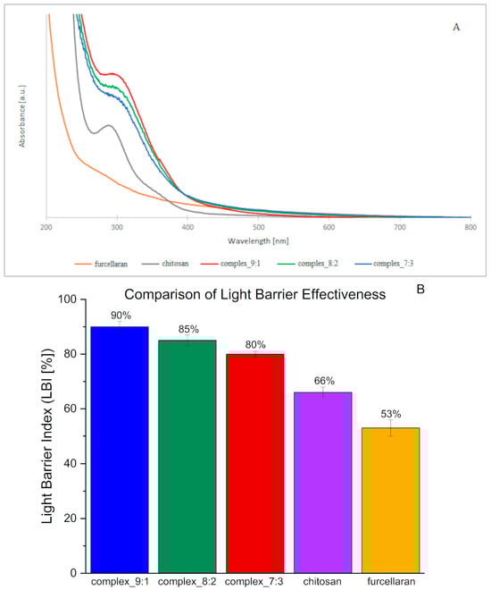 The barrier properties against visible and ultraviolet light of films and packaging materials play a very important role. Transmission spectra in the tested light range (200–800 nm) were performed for pure polysaccharides and their complexes (Figure A4). The transmission spectra revealed that the double-layer films result in an improvement in the barrier properties of the films against UV light, which is reflected by a drastic decrease in the transmittance values of the tested films in the range 200–400 nm with respect to the pure polysaccharides. This effect was observed to a greater extent for the bilayer film with CHIT-FUR complex layer at the ratio of 9:1. The obtained results are in line with a slightly higher value of the quantitative index of light barrier LBI (%) (Figure 4B), which indicates favourable barrier properties. This fact confirms the benefits of using this type of CHIT-FUR complexes for double-layer films, whose purpose is to protect food products from the harmful effects of light.