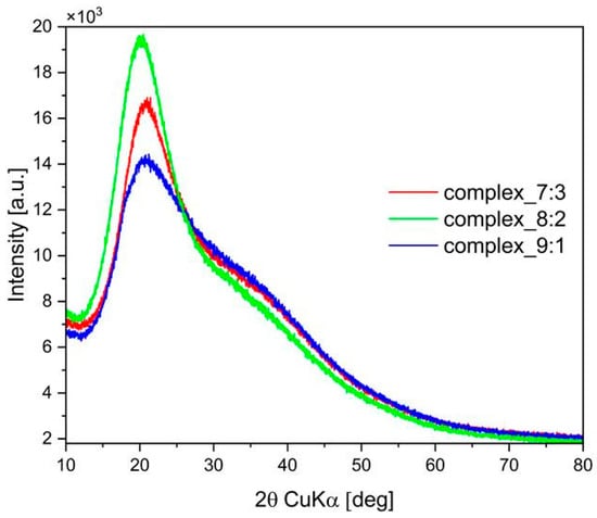The diffractograms of the films reflect the amorphous structure of the polymers from which they are composed (Figure 5). A Bragg reflection was observed at approximately 2Θ = 20°, which is characteristic of furcellaran. The presence of chitosan in the films caused a shift toward higher angles, 2Θ = 21–22° (2Θ = 21° for 7:3 and 2Θ = 22° for 8:2 and 9:1), which may indicate a compact crystalline structure of the inner layer. The broadening of the XRD peak also suggests a partially crystalline or less ordered structure in the case of the complex_9:1. The complex_8:2 shows a greater number and arrangement of crystallites, which correlates with the higher thermal stability revealed by TGA studies. The complex_9:1 also demonstrated high stability, as evidenced by the highest ΔH (statistically significant) and the most favourable mechanical properties. However, it contains the smallest amount of furcellaran, which means it does not achieve such a favourable inner layer with a high number of electrostatic interactions between –SO3− and –NH3+.
