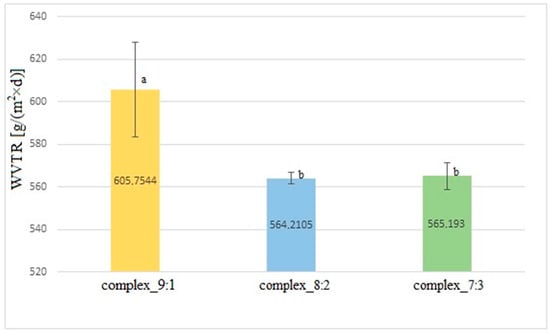 The highest water vapour transmission rate (WVTR) was observed for the double-layer film with the complex having the ratio of 9:1, while for the other films (8:2 and 7:3), comparable results were obtained. After statistical analysis of the results, it was found that the complex_9:1 sample differs statistically from the others, while the complex_8:2 and complex_7:3 films do not show any significant differences in comparison to one another. In the trial conducted by [], the highest WVTR value (approx. 900 g/m2·d) was characteristic of the chitosan film, while the lowest (600 g/m2·d) was typical of the furcellaran film. Materials from complexes of both of these compounds at the ratios of 9:1, 8:2 and 7:3 were characterised by an intermediate water vapour transmission rate. It was verified that the introduction of furcellaran into the chitosan matrix caused a decrease in the WVTR parameter. This was instigated by the thermal treatment of furcellaran, which lead to the decomposition of this compound and degradation of its chain, which could have resulted in a weakening of the interactions between the implemented biopolymers. These examinations allowed us to confirm the highest WVTR value obtained for the film with the highest share of chitosan.