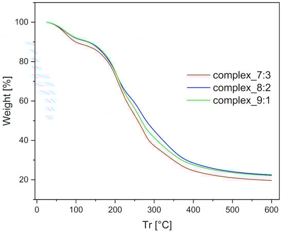 The first mass loss was observed up to 130 °C and can be attributed to the removal of free or loosely bound water. The complex_7:3 film contained the highest amount of physically bound water (approximately 2.5% more than the others) and exhibited the most open structure, which suggests the presence of numerous hydrogen bonding interactions. The next stage of mass loss was observed in the range of 130–400 °C and was assigned to degradation caused by the breakdown of the complex, starting at around 170 °C. Among the tested films, the complex_7:3 film degraded the fastest and with the greatest mass loss. In contrast, the complex_8:2 film showed the lowest degradation intensity, indicating greater stability compared to the complex_9:1 film. This property was most likely due to interactions between the two oppositely charged polymers. Finally, the mass variation in the temperature range of 400–600 °C was associated with polymer degradation within the films. The total mass loss at 600 °C, related to dehydration, was within the experimental error and identical for all double-layer films.