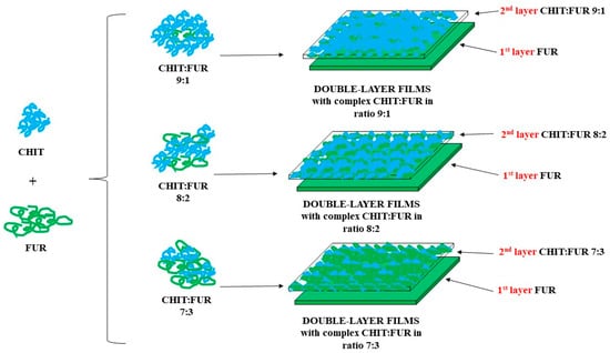 CHIT-FUR film is innovative because it is made from natural biopolymers, chitosan and furcellaran, which form stable complexes through electrostatic self-assembly. In aqueous solution, upon mixing chitosan with oppositely charged macromolecular polyanions of different types, polyelectrolyte complexes are formed by electrostatic self-assembly []. Nevertheless, the investigation of molecular interactions in polysaccharide complexes is difficult because the structure of monosaccharides shows the existence of isomers; their alternating ways of interconnection and the regularity of the monosaccharides are still insufficient []. A study conducted by [], it was proved that combining biopolymers with opposite charges results in the association of flexible chains consisting of macromolecules. As a result of electrostatic interactions, the total charge of the mixture decreased and the formed complex shrinks. In this study, it was verified that obtaining a film from the above-mentioned biopolymers depends on the applied temperature, pH of the environment, ionic strength and the correct proportion between these compounds. According to [], obtaining transparent and homogeneous furcellaran–chitosan films (CHIT-FUR) is only possible when the appropriate proportions between these polysaccharides are applied. In the cited research, CHIT-FUR complexes were prepared at three different weight ratios of the used polysaccharides (9:1, 8:2 and 7:3). The packaging films obtained in this way were characterised by good mechanical and thermal strength as well as resistance to moisture. Due to their applicative potential, they can be used as packaging materials in the food industry. Herein, our hypothesis was that it is possible to obtain double-layer films based on furcellaran and chitosan/furcellaran complexes, which will have a potential application value in food packaging materials. Additionally, the suitable proportion of polysaccharides in the chitosan/furcellaran complexes will allow selection of a double-layer film with the most interesting structural and functional properties.