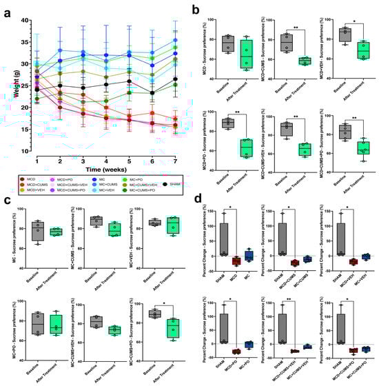 The Kruskal–Wallis test applied to the percent change in sucrose preference from baseline to post-treatment revealed increased anhedonia-like behavior in all MCD groups: MCD (−16.12 ± 12.46%; p = 0.0427), MCD + CUMS (−23.91 ± 8.34%; p = 0.0134), MCD + VEH (−19.29 ± 8.29%; p = 0.0134), MCD + PO (−28.89 ± 7.63%; p = 0.0181), MCD + CUMS + VEH (−24.90 ± 4.08%; p = 0.0051), MCD + CUMS + PO (−22.15 ± 8.22%; p = 0.0136), compared to SHAM (40.28 ± 68.28%). No differences were observed between MC-fed animals and SHAM controls (p > 0.05) (Figure 1d).