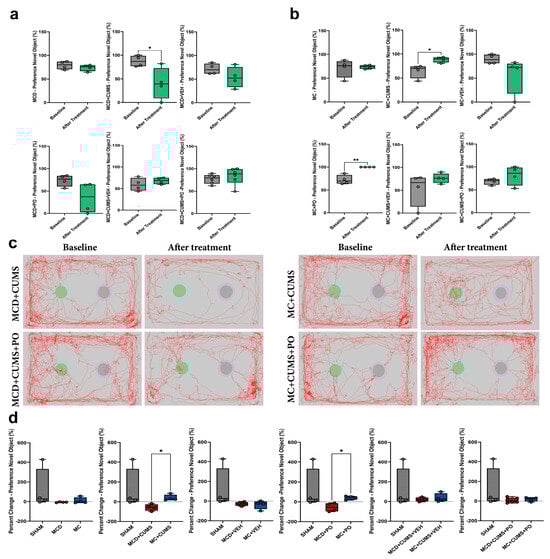 The analysis of the percent change in novel object preference from baseline to post-treatment revealed a significant reduction in the MCD + CUMS group compared to the MC + CUMS group (Kruskal–Wallis test; p = 0.0132), as well as in the MCD + PO group compared to MC + PO animals (Kruskal–Wallis test; p = 0.0263). No significant differences were found among the remaining groups (p > 0.05) (Figure 3d).