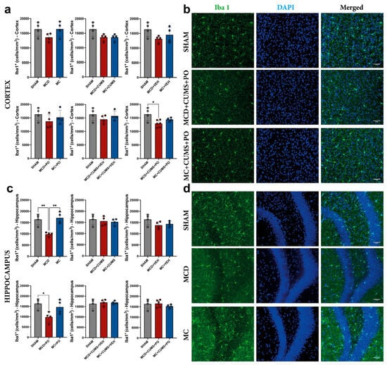 We also observed differences between treatments at the hippocampal level (one-way ANOVA; F2,9 = 15.26, p = 0.0013), with MCD mice showing reduced Iba1 density (9809 ± 871.2 cells/mm3) compared to both SHAM (16,351 ± 2380 cells/mm3; p = 0.0037) and MC (17,080 ± 2487 cells/mm3; p = 0.0019) groups. PO treatment did not change this microglial inhibition, as MCD + PO mice still showed reduced Iba1 density (9800 ± 2548 cells/mm3) compared to SHAM (16,351 ± 2380 cells/mm3; p = 0.0225), with one-way ANOVA indicating differences between treatments (F2,9 = 5.907, p = 0.0230) (Figure 4c,d).