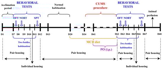 All animals were weighed weekly throughout the experiment. Behavior testing was conducted both at baseline and at the end of the experimental period, using the SPT for anhedonia-like behavior, OFT for anxiety and exploratory behavior, and NORT in order to assess memory [].