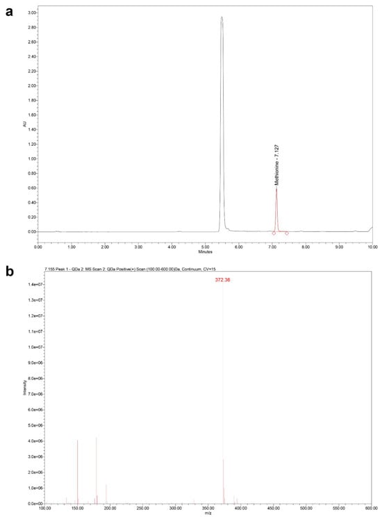 Prior to UHPLC injection, the amino acids in the hydrolysate were derivatized using FMOC. Following the principles outlined for FMOC derivatization, the reaction was performed using borate buffer (pH 9.0) and FMOC reagent (5 mM in ethanol), allowing for a short reaction time (5 min) []. This attaches the FMOC group (molecular weight (MW) 222.24 g/mol) to the methionine molecule (MW 149.21 g/mol), resulting in FMOC–methionine (MW 371.45 g/mol) (Figure 8a).
