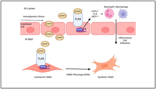 A positive feedback loop maintains chronic inflammation within the aneurysm wall of IAs. NF-κB activation increases IL-6 transcription, augmenting NF-κB signaling [33]. This pro-inflammatory environment leads to the development of aneurysms and the advancement of vascular injury [33,34]. In addition, tumor necrosis factor-α (TNF-α) is a pro-inflammatory cytokine induced by tissue injury. It primarily signals through its receptor, tumor necrosis factor receptor-1 (TNFR1), leading to activation of the NF-κB pathway via a mechanism distinct from DAMP-induced TLR4 signaling [35]. It is important to note that, in addition to its pro-inflammatory effects, TNF-α also induces phenotypic modulation of VSMCs, promoting a remodeling state characterized by the upregulation of MMPs [36,37].