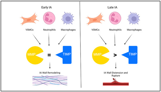 Extracellular matrix remodeling in intracranial aneurysm (IA) begins early, with matrix metalloproteinases (MMPs) balanced by tissue inhibitors of MMPs (TIMPs). In late IAs, the MMP-to-TIMP ratio increases, leading to wall distension and rupture.