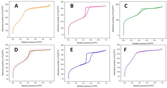 N2 adsorption-desorption isotherms of (A) HMS-NbZr, (B) HMS-Nb, (C) HMS-Zr, (D) SBA-NbZr, (E) SBA-Nb, and (F) SBA-Zr.