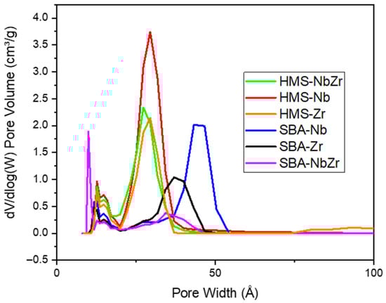 The pore size distribution analysis (Figure 2) revealed that, in general, the SBA-based catalysts presented a more heterogeneous distribution of pore sizes, as they showed two contributions, one with a lower pore width (around 20 Å) and another with higher values (around 40 Å), with SBA-Nb being the one that presented the highest second contribution at approximately 45 Å. The HMS catalysts showed a narrow pore size distribution, centered at around 35 Å. The SBA silicas presented two contributions to the pore size distribution, as one of them was attributed to the mesoporous structure and the other one to the micropores associated with the silica channels and connections between pores [,], while the HMS silicas showed a very ordered and uniform mesoporous structure due to their synthesis through the generation of micelles, and therefore a narrow distribution of their pores [].
