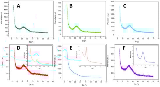 X-ray diffraction patterns of (A) HMS-NbZr, (B) HMS-Nb, (C) HMS-Zr, (D) SBA-NbZr (inset: small-angle X-ray scattering pattern of SBA-NbZr), (E) SBA-Nb (inset: inset: small-angle X-ray scattering pattern of SBA-Nb), and (F) SBA-Zr (inset: inset: small-angle X-ray scattering pattern of SBA-Zr).