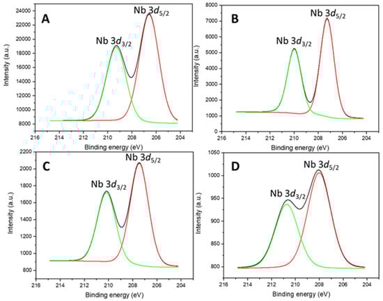 Nb 3d core level spectra of (A) SBA-Nb, (B) SBA-NbZr, (C) HMS-NbZr, and (D) HMS-Nb.