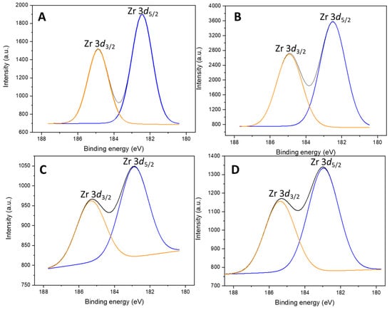 The oxidation state of the Nb and the Zr was also possible to determine through XPS (Table S3, Figure 4 and Figure 5). Irrespective of the support, in the catalysts containing Nb2O5, the only species found was Nb5+, as the Nb 3d doublet at 206 and 210 eV confirmed [,], and in the materials impregnated with zirconium, it showed the characteristic Zr 3d doublet at 183 and 185 eV [,], corresponding to Zr4+ in an oxidic environment.