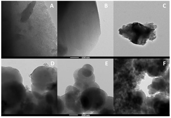 The morphology of the materials was studied by means of TEM analysis (Figure 6). Moreover, in order to confirm the dispersion of the metal oxides over the surface of the silicas, an EDX analysis was carried out. Data reported in the literature on the morphology of HMS mesoporous materials have already suggested the presence of globular structures []. The HMS-based catalysts showed particles with a globular structure; these globular structures are the results of the kind of synthesis carried out for their obtention, where the surfactant along with the template and the solvent create a micellar-like structure that then collapses and evolves into HMS when the silica precursor is added. In the case of SBA-based catalysts, the characteristic hexagonal parallel channels were clearly discerned in the micrographs of the catalysts, the result of encapsulating the structural director molecule or template into the silica framework creating a rigid and robust support. When the micrographs of the synthesized catalysts were compared with those of the pristine supports (Figure S2), it was observed that the deposition of the metal oxides caused no considerable change on the structure of the supports, as the HMS maintained its globular shape while SBA kept the microchannels unchanged. The EDX analysis of both the HMS- and SBA-based catalysts showed a uniform dispersion of Nb or Zr, as was also inferred from the XRD data, as no relevant crystallographic signals were observed (Figure 3), with the exception of SBA-Zr (see Supplementary Materials), thus discarding the formation of segregated oxide species of both metals (Figures S3–S5).