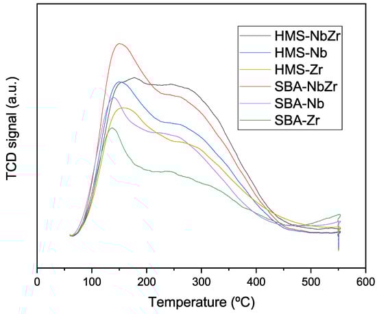 On the other hand, the HMS support provided a higher concentration of acid sites than the SBA support; it is likely that this support better disperses the active phase and therefore more active sites are available. However, when the density of acid sites was considered, the best results were those from the SBA-based catalysts, since these catalysts showed lower surface areas. These results, as summarized in Table 3, show that the majority of the acid sites present in these materials were of weak (100–200 °C) and moderate (200–300 °C) nature [], with a limited contribution of strong acid sites (300–550 °C). The ratio of weak to moderate nature tended toward 2/1 for most silicas, with the exception of HMS-NbZr and HMS-Nb, which showed a 1/1 ratio. The total acidity was in general similar, although the Nb2O5 catalysts manifested a slightly higher acidity when compared with the ZrO2 analogues. The highest acidity was achieved by the SBA-NbZr catalyst (460 μmol/g).
