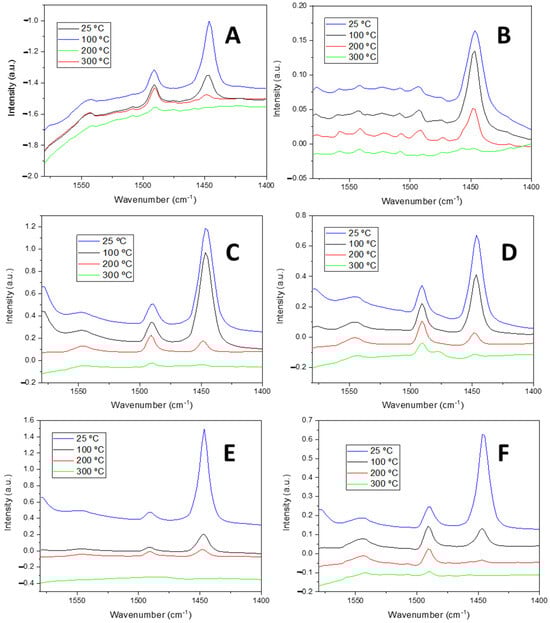 The absorption band located at ca. 1450 cm−1 was assigned to the 19b vibration mode of pyridine interacting with Lewis acid sites, whereas that at ca. 1545 cm−1 was associated with the 19b vibration mode of the pyridinium cation, resulting from the interaction of the pyridine molecule with Brønsted acid sites. The band at approximately 1490 cm−1 corresponded to the 19b vibration mode of pyridine, which refers to the mixed interaction of the pyridine with both Lewis and Brønsted acid sites [,,]. Through the integration of these signals, the acidity of the materials can be obtained, as proposed by Emeis []. The temperature of desorption of the pyridine can be correlated with the acid strength in such a way that pyridine molecules desorbed at 100, 200, and higher than 300 °C are associated with weak, moderate, and strong acid strength, respectively.