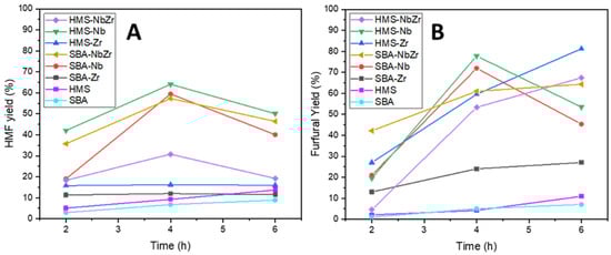 The SBA-Zr presented very low activity at both reaction temperatures of 160 and 180 °C for the dehydration of the sugars into HMF and furfural, presumably due to the fact that this material had the lowest acidity, as confirmed by NH3-TPD and pyridine adsorption, and the worst textural properties and dispersion of the active phase, as suggested through XRD. For HMS-NbZr, despite its excellent acid properties (see Table 3 and Table 4) and a great surface area and pore volume, its performance for both temperatures was lower than expected. This could be attributed to the fact that HMS-NbZr presented the lowest external surface and the highest micropore to external surface area ratio, meaning that the diffusion of sugars and products could be hindered, especially for hexoses and HMF, as they are larger than pentoses and furfural. Its bimetallic analogue, SBA-NbZr, presented a very different behavior. Although their acid properties were similar and its surface area was significantly lower than that of HMS-NbZr, SBA-NbZr possessed a greater external surface area and a much lower micropore to external surface area ratio due to the porous structure composing this silica, which was rather mesoporous as its pore size distribution confirms (see Figure 2). This feature was especially beneficial for the production of HMF, and it translated into an excellent performance of the catalyst. However, even if SBA-NbZr seemed superior in terms of acidity to SBA-Nb, it still outperformed the former in the production of furfural. This could be related to the higher surface area of SBA-Nb, and especially to the higher external surface area and pore volume. The only catalyst that outperformed SBA-Nb out of the catalysts assayed was HMS-Nb for both HMF and furfural production. HMS-Nb presented the highest BET surface area, and although there was a high contribution of micropores, the external surface area was considerably high as well as the pore volume and diameter, which were the highest out of the synthesized catalysts. In terms of acidity, HMS-Nb possessed one of the highest values according to NH3-TPD and pyridine adsorption as well as the highest number of Lewis acid sites, a necessary condition for the isomerization of glucose into fructose [], and for the dehydration of the latter into HMF [], along with a fair number of Brønsted acid sites, responsible for the dehydration of pentose into furfural []. All of these characteristics resulted in the highest catalytic performance out of all silicas. Surprisingly, its Zr analogue did not show the same potential for HMF production; nevertheless, this can be easily justified, as HMS-Zr had a lower BET surface area and a considerably smaller average pore diameter, along with a much lower Lewis acidity. However, unlike SBA-Zr, HMS-Zr was acid enough in terms of Brønsted acidity to promote the dehydration, but the average pore diameter was probably responsible for a slower diffusion, and thus the peak performance of this catalyst was achieved after 6 h of reaction time. The Nb2O5-based catalysts presented a higher acidity than those based on ZrO2, and in general, when Nb was present, the number of Brønsted acid sites was also higher [,,]. In general, when the active phase was Nb2O5, the reaction yields were higher, but the deactivation of the catalyst was also faster, diminishing the reaction yield after 4 h of reaction time. A reason for this fast deactivation compared with the Zr-based catalysts could be found when studying the acidity through pyridine adsorption coupled to FTIR spectroscopy. Generally, the Nb-containing catalysts presented a higher number of weak Lewis acid sites that could allegedly be more active than the rest of the catalytic sites but more prone to deactivation. The pristine supports were also assayed in the catalytic dehydration of the sugars. As expected, the yields provided by the pristine silicas were significantly lower than those that presented the deposition of metal oxides such as Nb2O5 and ZrO2.